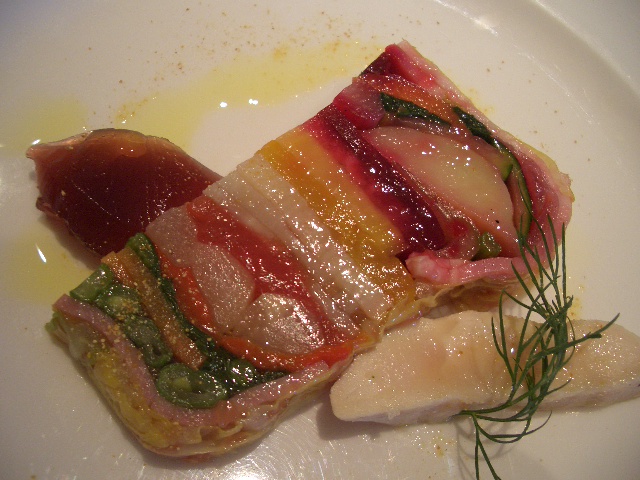 前菜は野菜のテリーヌです!見てください!!この美しい層を!!ベーコンがアクセントになっていて野菜だけどさっぱりし過ぎてなかった~v