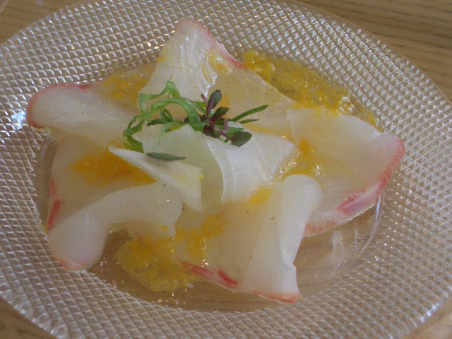 「天然真鯛のカルパッチョ」甘夏のソースが新鮮です。そしてこのアボガドは揚げてあるんですよ~初めて食べたですよ!家でもチャレンジしたい(>_<)小さいボールはおからです~期待してなかったら、めちゃ美味しくてびっくり!!