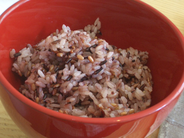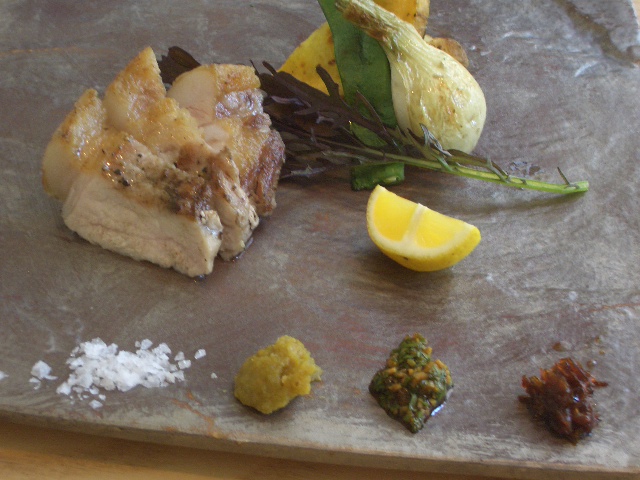 メインは豚肉のグリルで~す!薬味で味を変えて楽しめます。柚味噌?が美味しかったな~wお米は「古代米」でした。ぷちもちして美味しかったですww