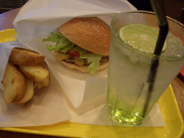 乗りたくないバスに乗って駅前へ。昨日サロンで教えてもらったフレッシュネスバーガーのライムソーダを飲むためにマックを通過。なんかお腹が空いたのでチーズバーガーもオーダー!なんて高カロリー!!